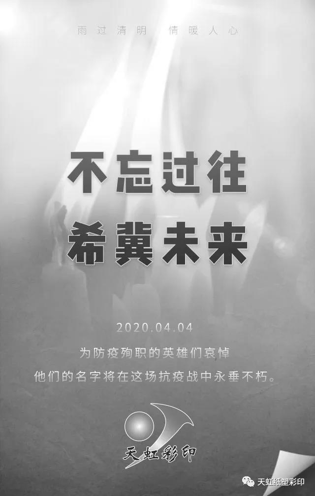 為表達(dá)在抗擊新冠肺炎疫情戰(zhàn)斗中犧牲的烈士和逝世同胞的深切哀悼,4月4日上午10時(shí)整,武漢市天虹紙塑彩印有限公司降半旗致哀,公司董事長陳志浩帶領(lǐng)行政管理人員集體默哀3分鐘,向英雄致敬,為逝者祈福!